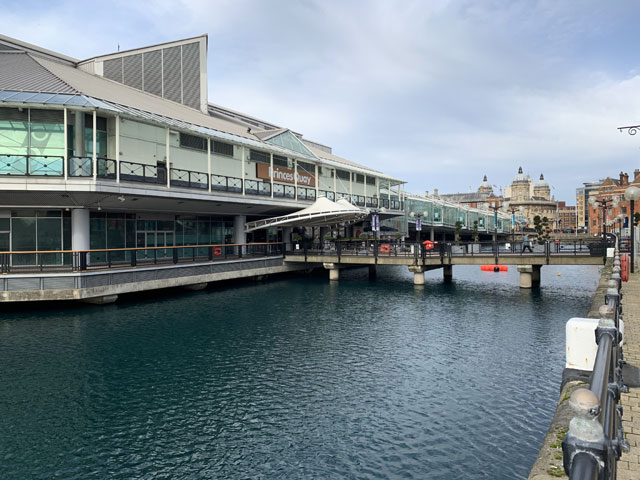 The glass covered shopping area is seen to rise out of the water and hovers on stilts above the Princes Dock and is the area's largest shopping complex.